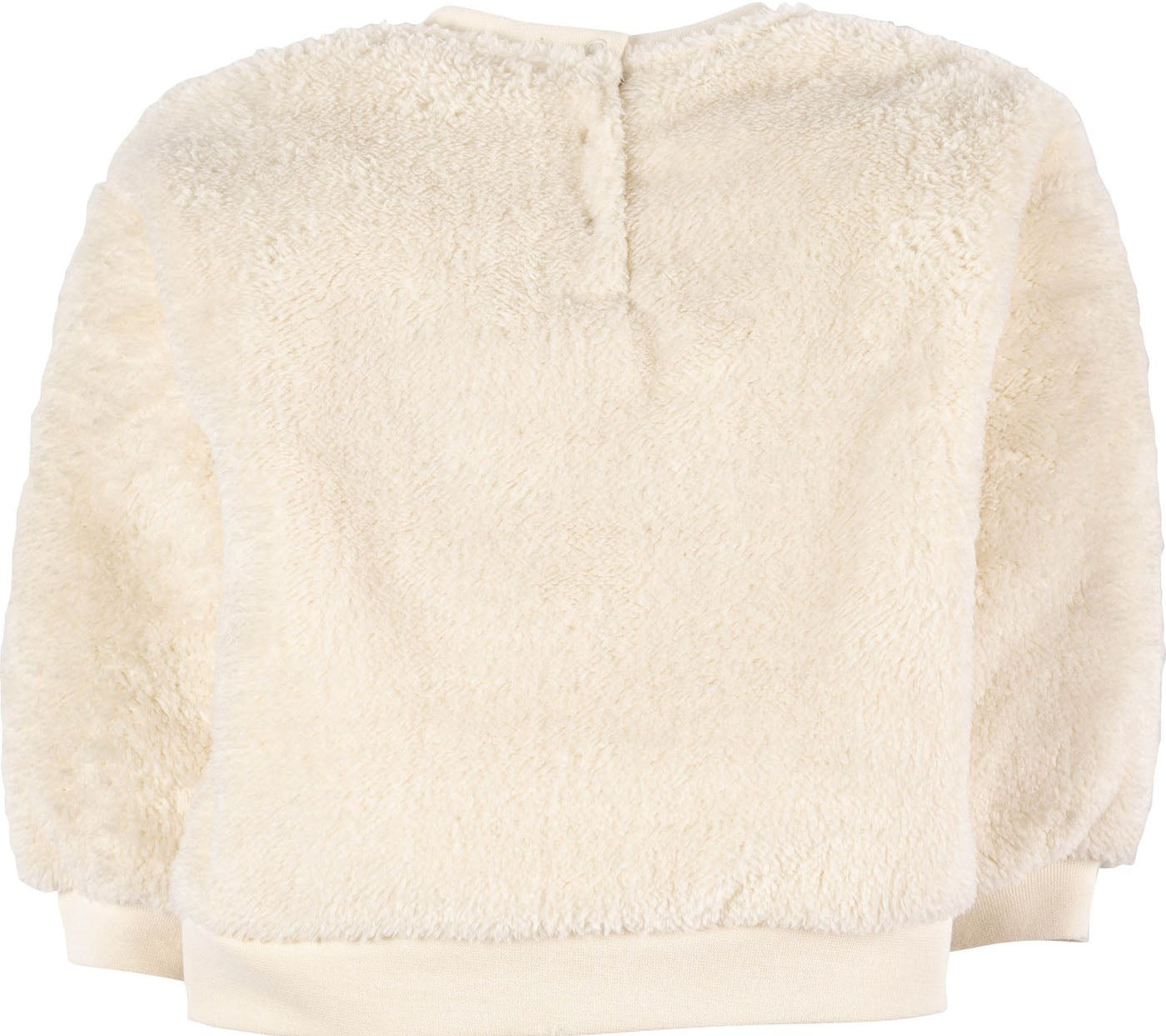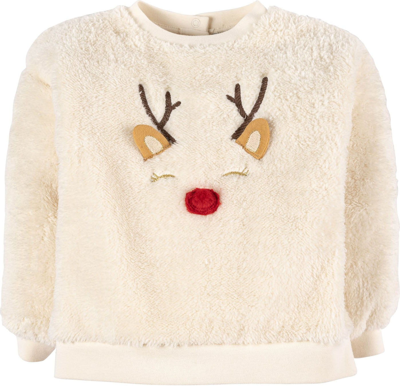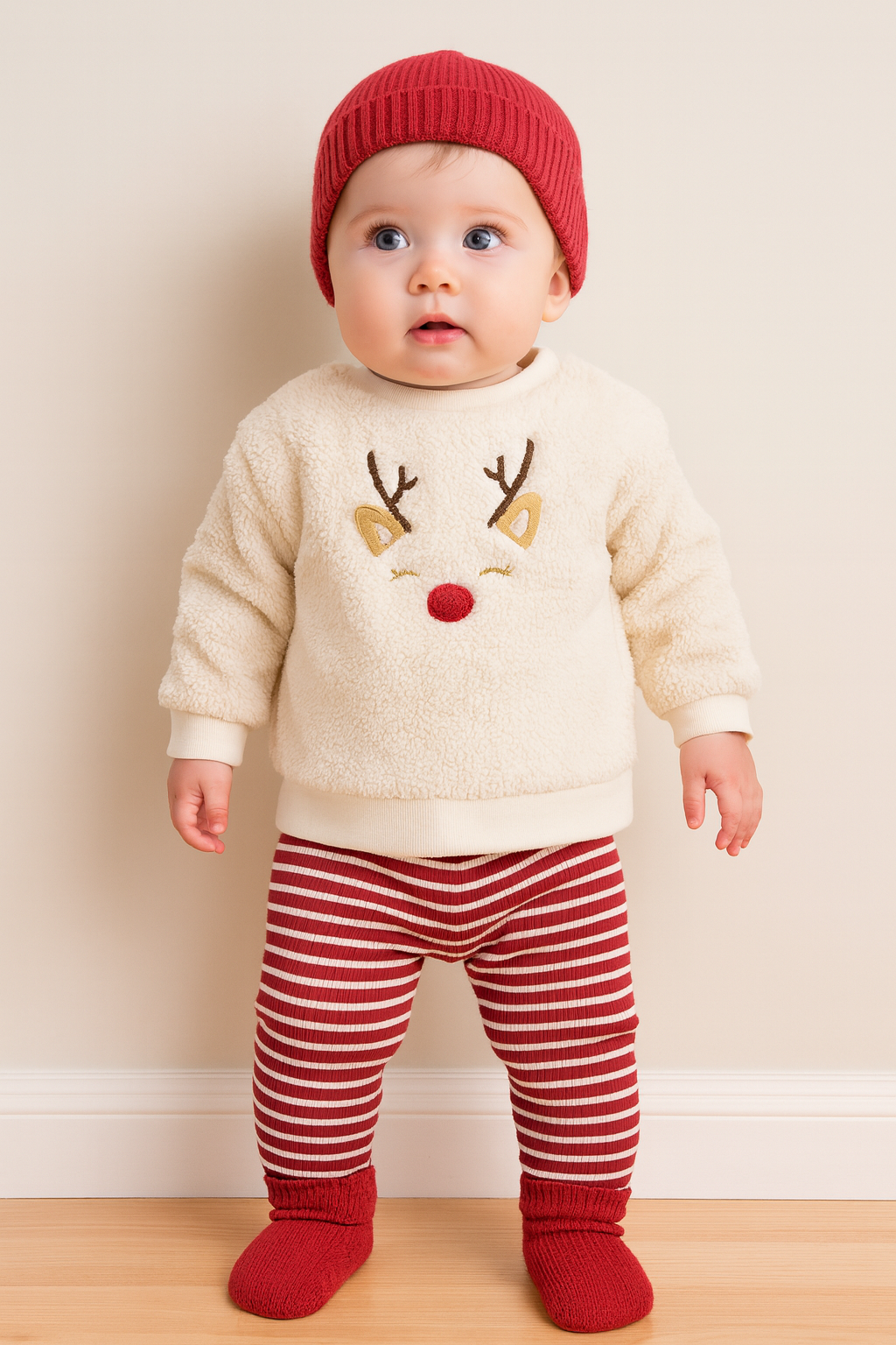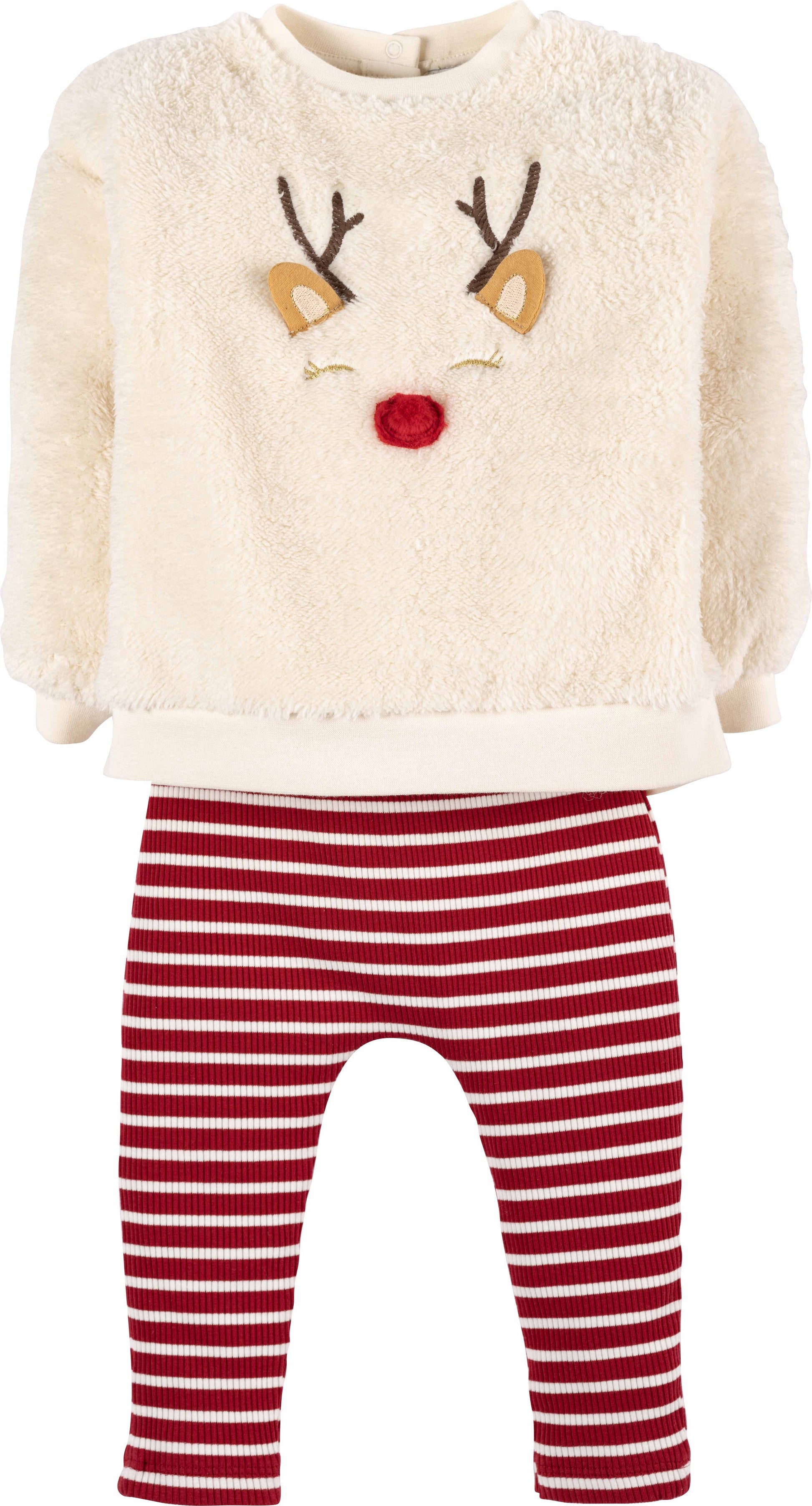סט חורפי לתינוקות הכולל סווטשירט פרוותי בצבע שמנת עם רקמת אייל חמודה ומכנסי פסים אדומים-לבנים. נעים, מחמם ומושלם לימים הקרים.
