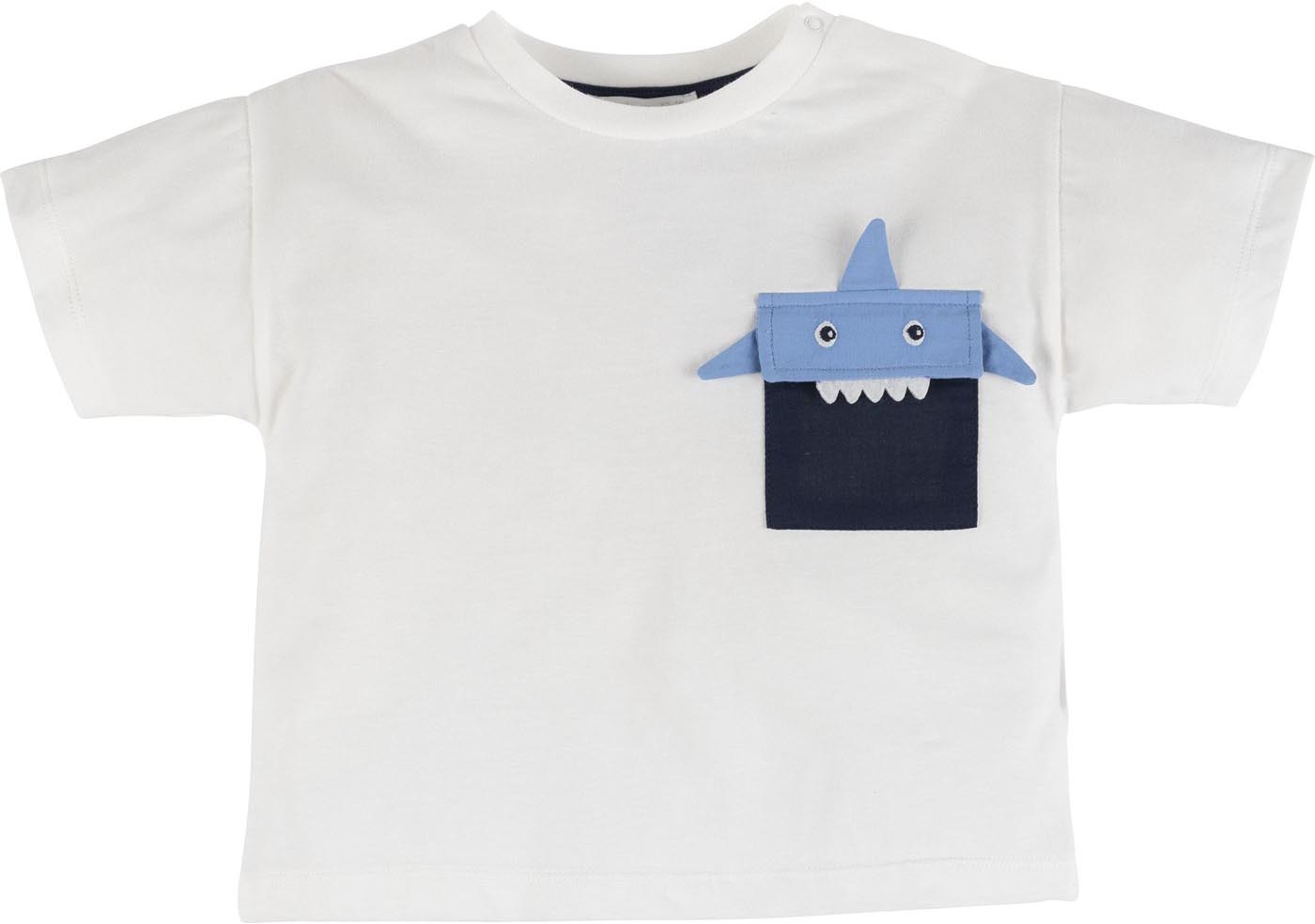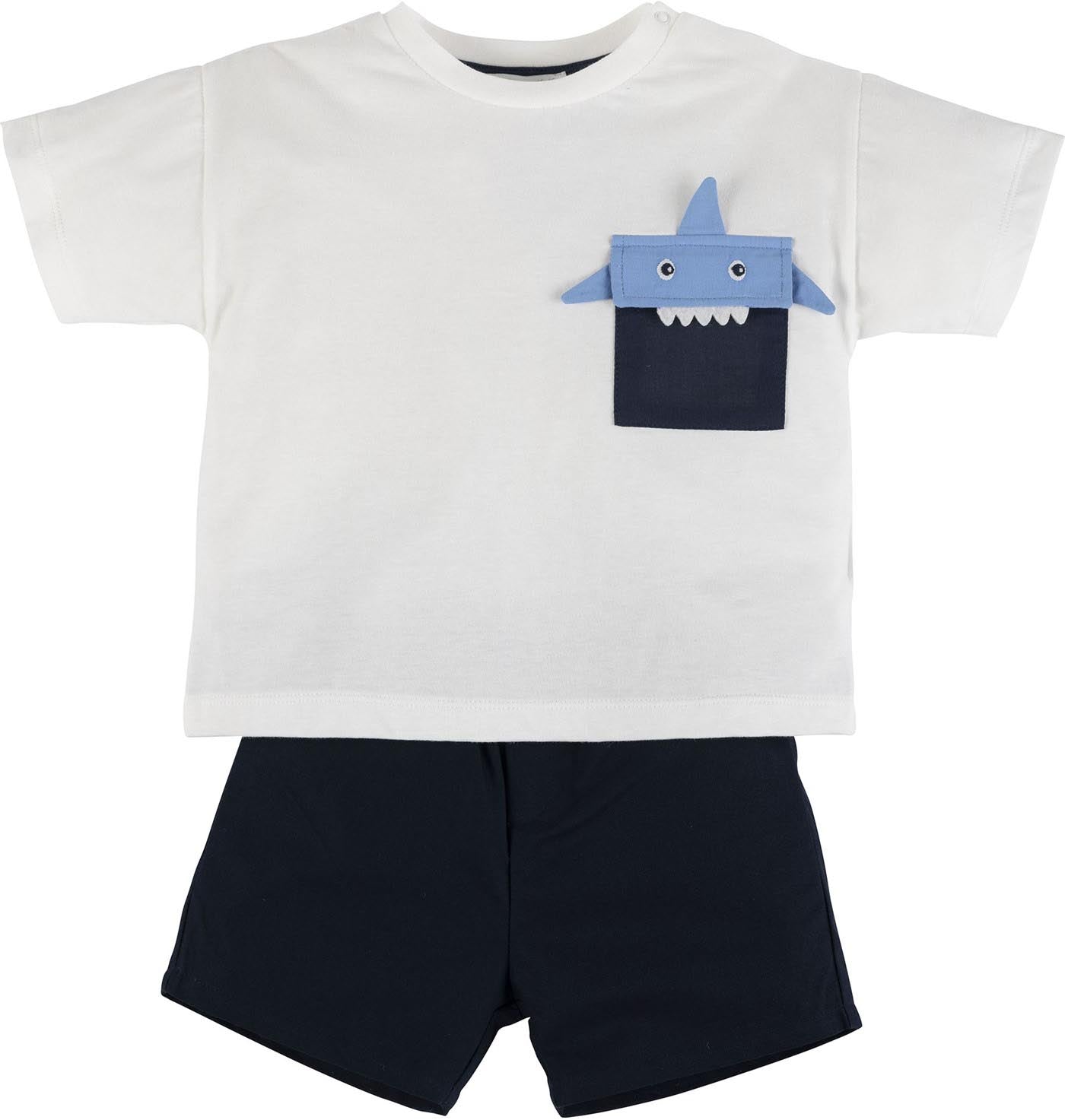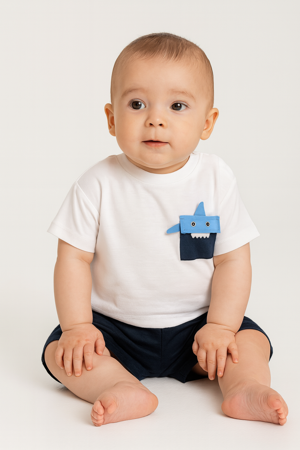 הכירי את סט "כרישון" – חולצת כותנה רכה בצבע לבן עם כיס משעשע בעיצוב כריש תלת-ממדי, בשילוב מכנסיים קצרים כחולים לנוחות מקסימלית.