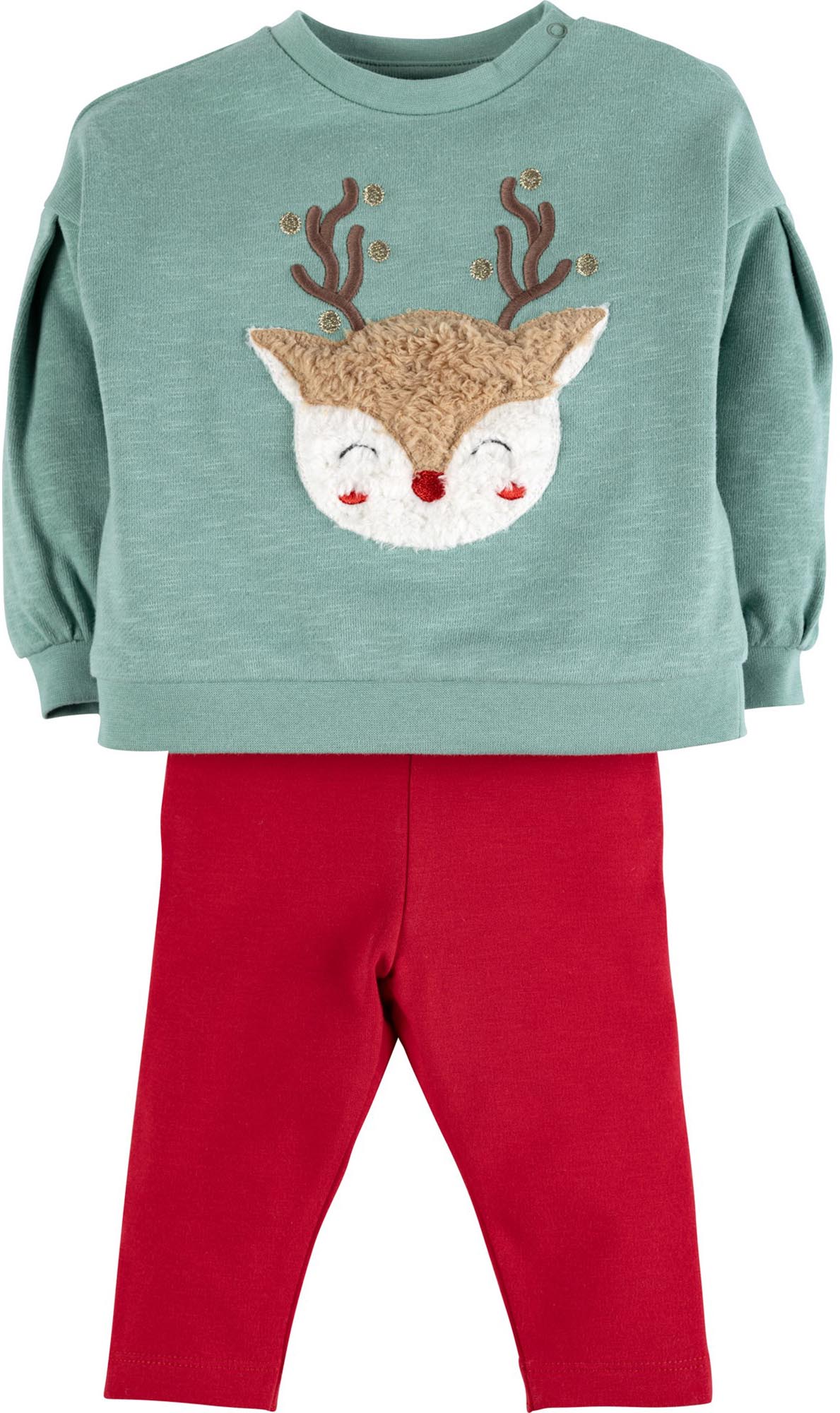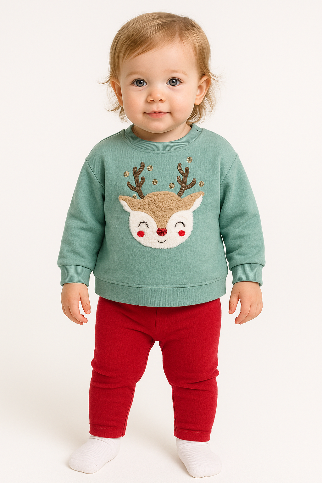 סט מתוק ומיוחד הכולל סווטשירט ירוק עם דמות אייל פרוותית ומלאת קסם, בשילוב טייץ אדום אלסטי ונוח ללבישה יומיומית או חגיגית. עיצוב חורפי קלאסי שישמור על הסטייל והנוחות גם יחד.