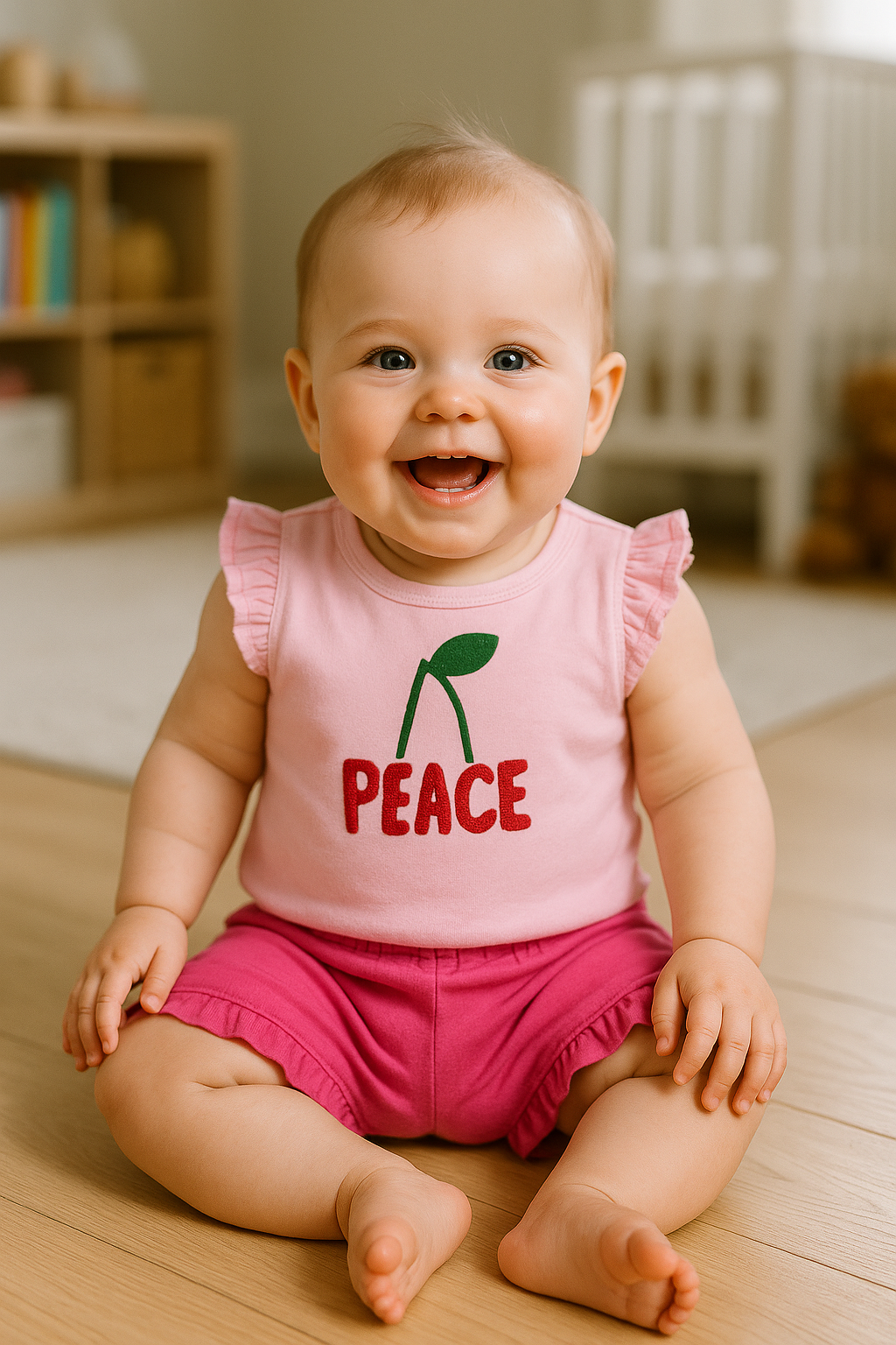 לבוש בעיצוב דובדבנים שובב עם הכיתוב PEACE – מושלם ליום קיץ נעים בחדר המשחקים או בטיול קליל.