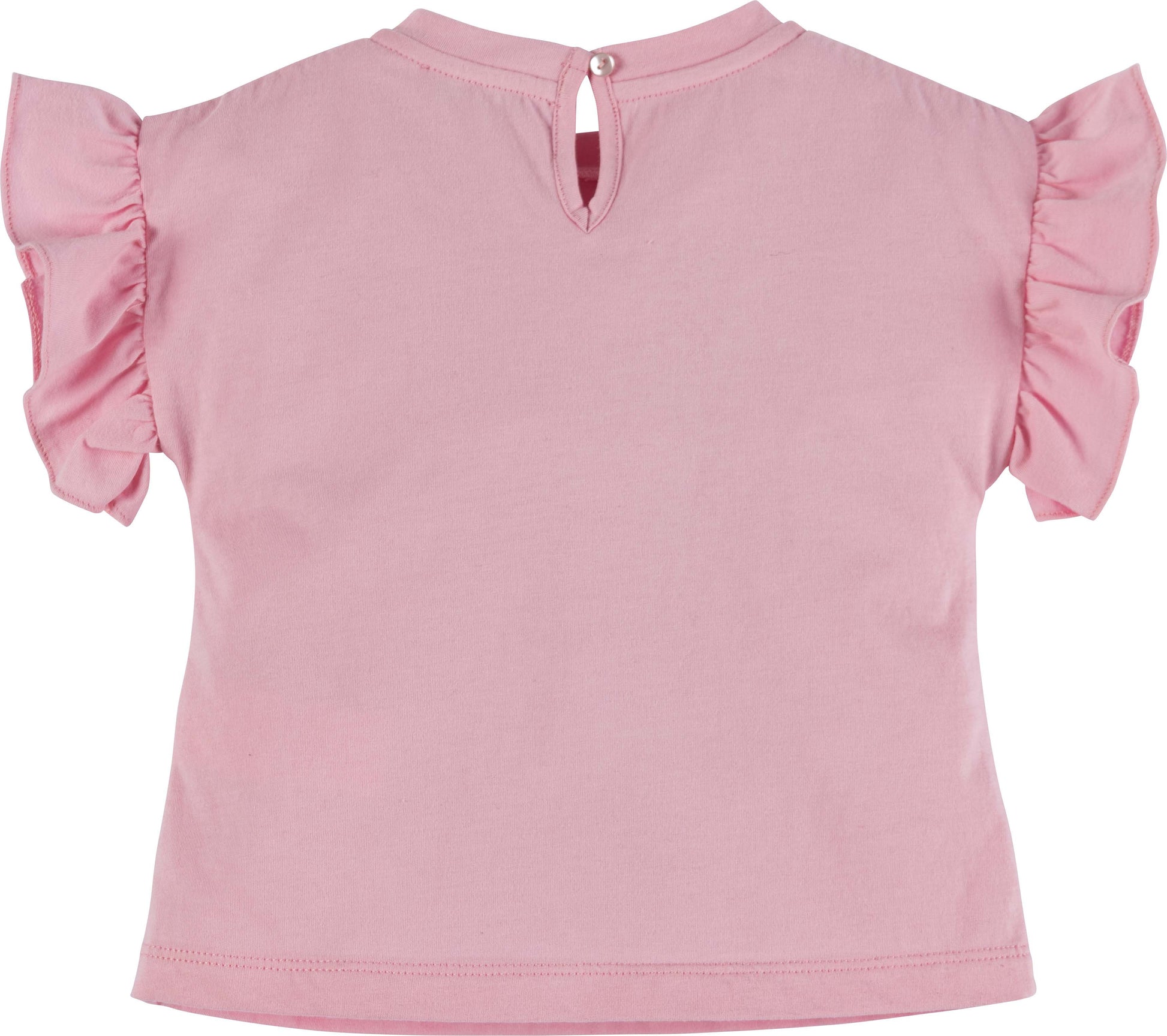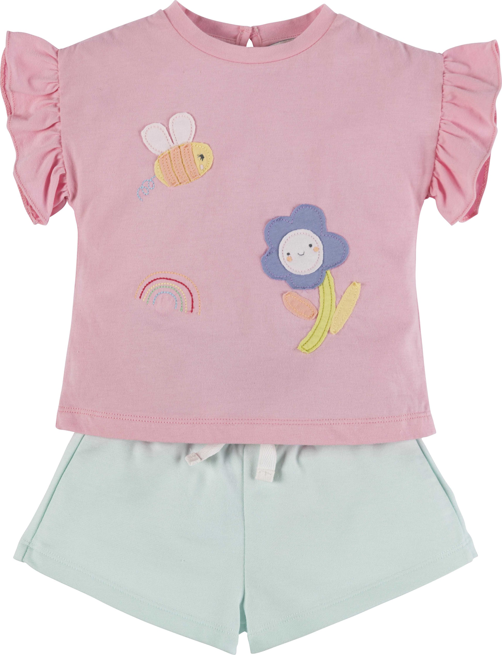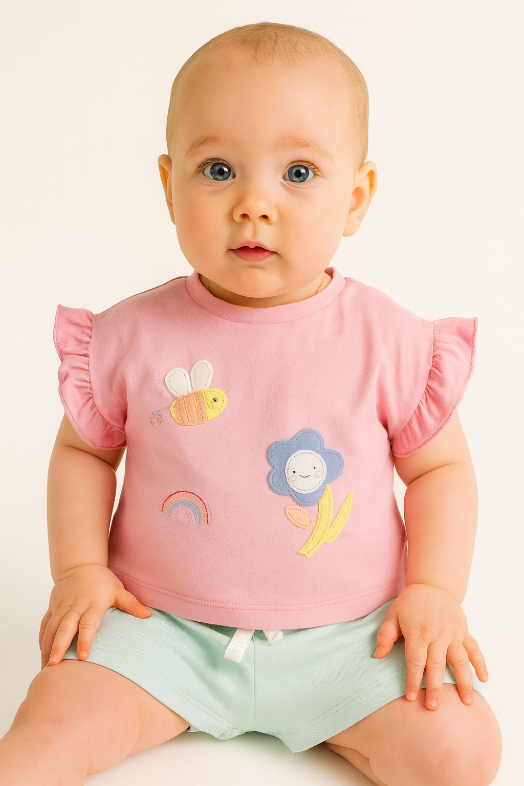 הכירי את סט 'שירן' – חולצה ורודה עם הדפסי דבורה, פרח וקשת בענן בשילוב מכנסונים בצבע מנטה רך – שילוב מנצח של נוחות וסטייל לקטנטנות.
