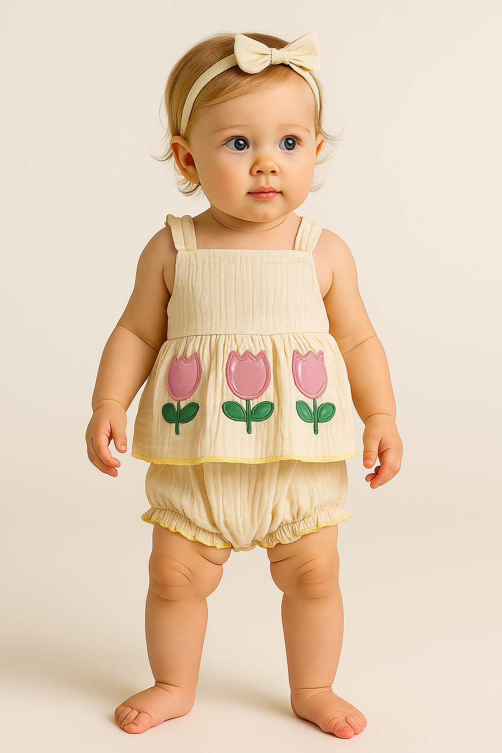 סט קיץ מתוק מבד כותנה רך ונושם, הכולל חולצה עם כתפיות ועיטור פרחי טוליפים ורודות ותחתון תואם בגזרה נפוחה. עיצוב רך ונעים למגע, מושלם לימי הקיץ החמים ולמראה טבעי ומלא חן.